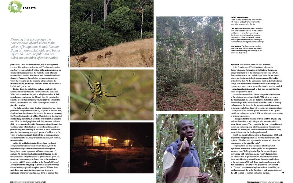 Veronica Tremblay visits Bouamir Research Station in Cameroon's Dja Faunal Reserve and recounts her experiences in Travel Africa magazine.